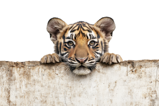 Adorable tiger cub peering over a rough concrete wall, cut out - stock png.