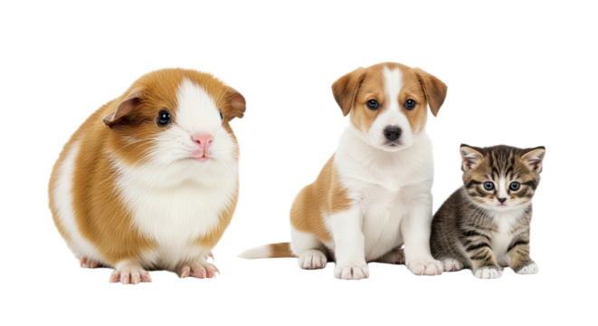 Cute guinea pig, puppy, and kitten sitting together isolated on white background, adorable small pets group, perfect for pet care and animal themes