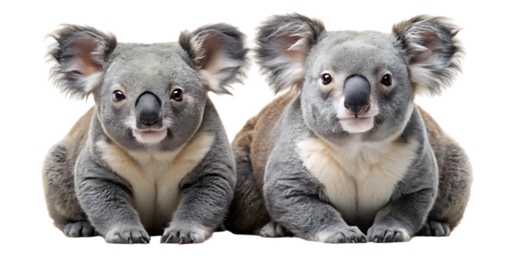 Two adorable koalas sitting side-by-side, their fluffy grey fur and gentle expressions captured in a close-up portrait, isolated on white.