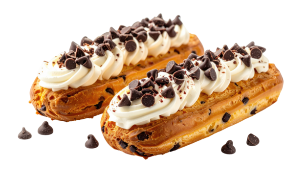 Two chocolate-chip eclairs, topped with creamy white frosting, lie diagonally, against a black background.  Sprinkles of chocolate chips decorate the frosting