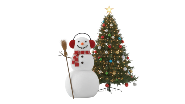 Cute Snowman with Decorated Christmas Tree Holiday Scene Isolated on Transparent Background