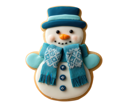 Happy decorated snowman cookie sweet festive dessert perfect for winter Christmas holiday celebration. Cheerful baked treat with blue scarf isolated on transparency background