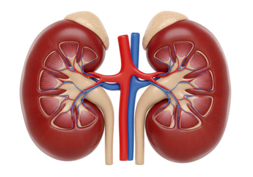 Detailed anatomical models of human kidneys and adrenal glands on a white background
