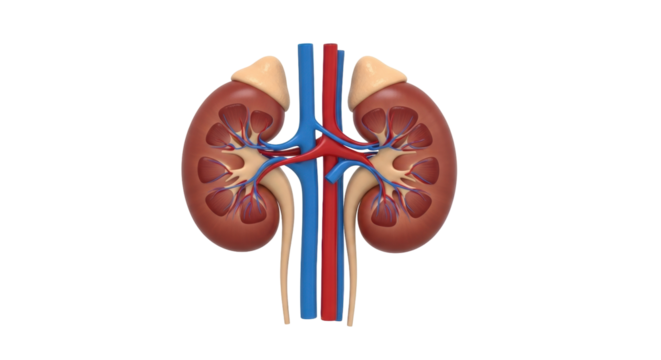 3d rendering of a human kidney, highlighting renal artery, vein, ureter, and adrenal gland, isolated on transparent background
