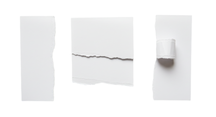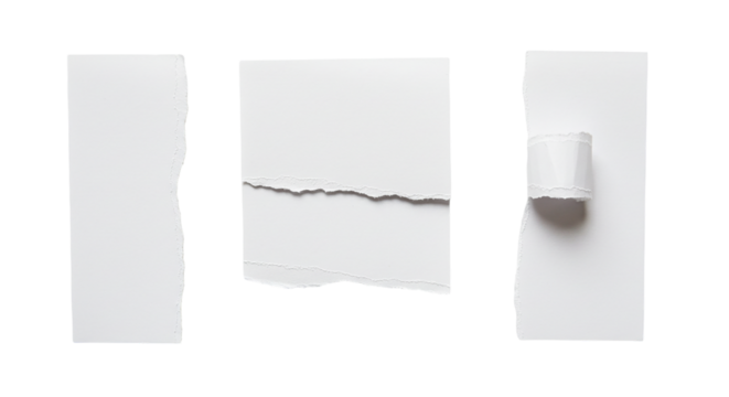 Three stark white torn paper fragments adrift in a vast black void echoing raw creativity and on transparent background
