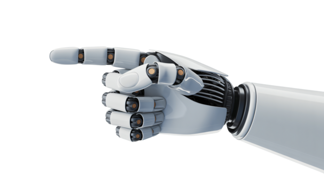 Robot hand pointing gesture in futuristic design with metallic silver finish on white background for technology advertisement