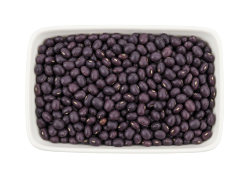 Isolated serving of raw black adzuki beans in container ready for cooking, healthy legume
