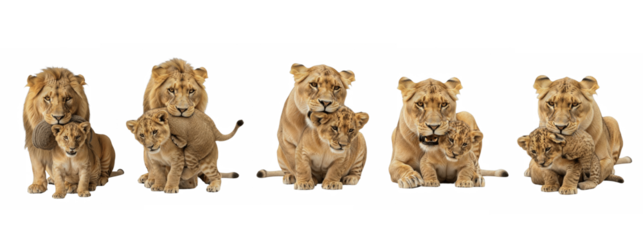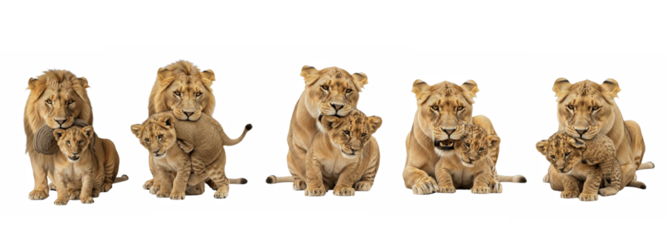 Set Of Lion Family isolated, Lioness, Lion Cub. Adult Lion ,  father and sons with mothers PNG