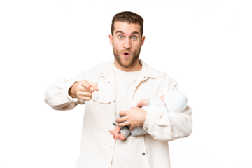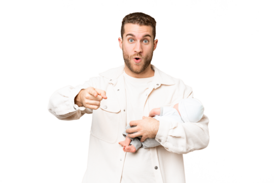 Young handsome blonde man with his newborn baby over isolated chroma key background surprised and pointing front