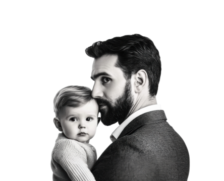 Smiling father and son portrait with arm around shoulder isolated on transparent background