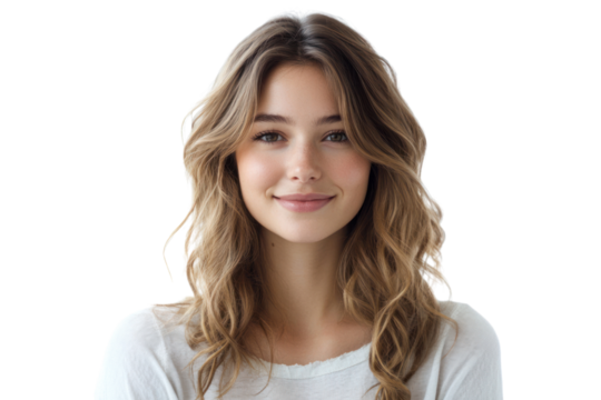 Confident young woman with wavy hair, casually dressed, facing the camera with a happy and welcoming expression.