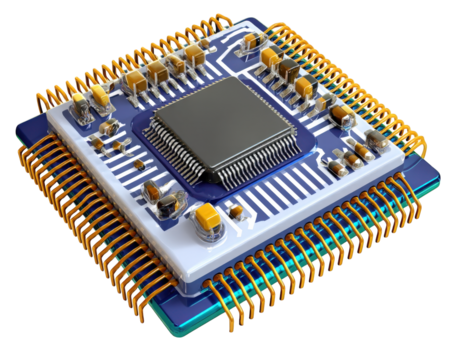 Close up of a modern computer processor chip with glowing blue light and gold pins isolated on transparent background