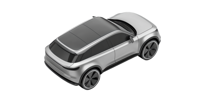 Transparent background, a gray colored modern electric suv car at a front left angle, showcasing its aerodynamic lines and modern styling in a high-quality 3D render.