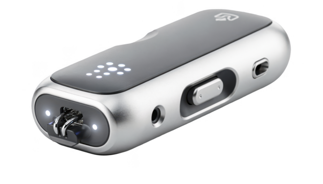 Closeup of a compact neurostimulator device isolated on a white background highlighting its sleek design and advanced technology for remote brain therapy.