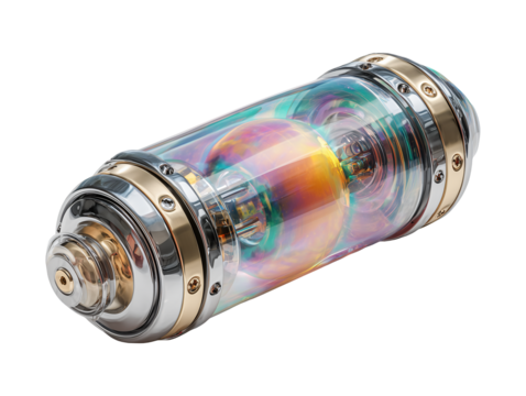 Sleek, futuristic modular device of metal and glass with blue LED accent, on white surface, soft studio light, subtle bokeh. Concept of advanced technology and precision