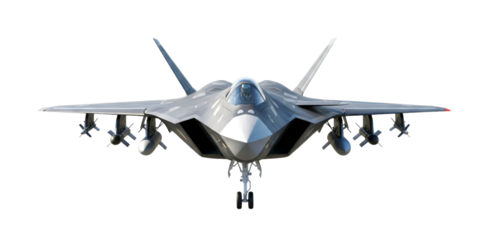 Sleek grey stealth fighter jet with missiles and bombs attached to its wings is shown from a front perspective, conveying power and advanced military technology