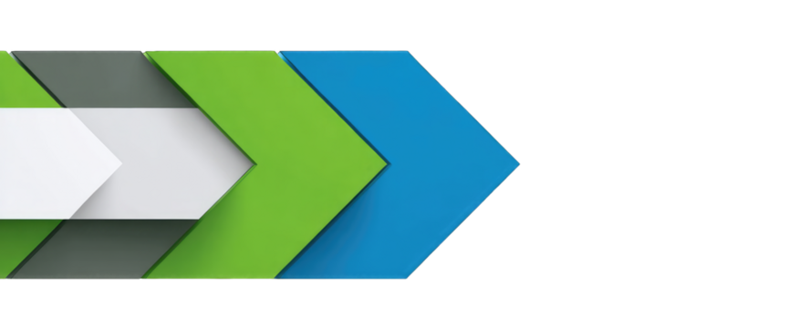 Layered arrow graphic, showing a progression or process, in shades of green, gray, white, and blue
