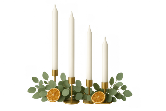 Advent candles with eucalyptus and dried oranges arrangement on transparent background, symbolizing christmas holiday spirit