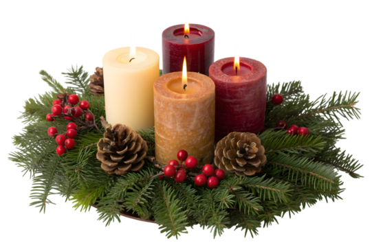 Festive christmas advent wreath with burning candles, pine cones, and red berries isolated on transparent background, creating a warm and cozy holiday atmosphere