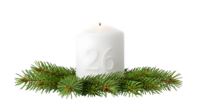 Advent candle with the number 26 and fir branches isolated on transparent background, a symbol of christmas and the prechristmas season