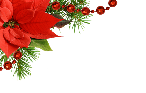 Christmas corner arrangement with pine twigs and poinsettia flowers isolated