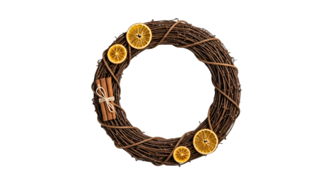 Festive holiday wreath adorned with dried orange slices and cinnamon sticks, ideal for Christmas greeting cards, Advent decorations, winter season blog posts, or crafting advertisements.