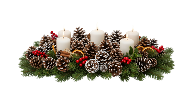 Christmas advent wreath with candles and pine cones isolated on transparent background