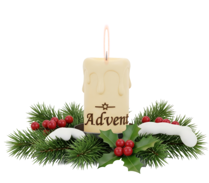 A lit candle with the word 'Advent' on it, surrounded by holly and berries, against a png transparent.