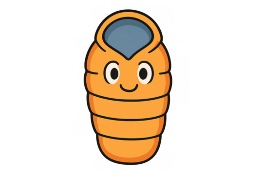 Smiling cartoon sleeping bag character enjoying outdoor camping and adventure, happy kawaii illustration