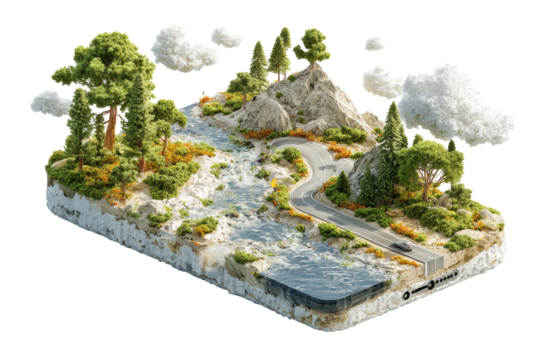 Scenic landscape on a phone screen nature road trip adventure, isolated on a transparent background