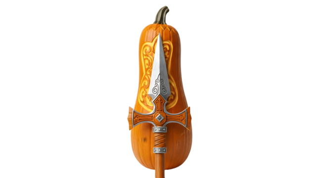 Fantasy pumpkin warrior with ornate sword design ready for epic autumn adventures