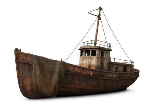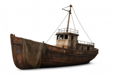 Weathered fishing vessel displaying frayed net, symbolizing maritime decline and forgotten maritime heritage