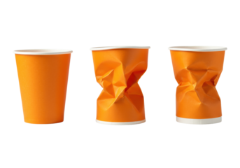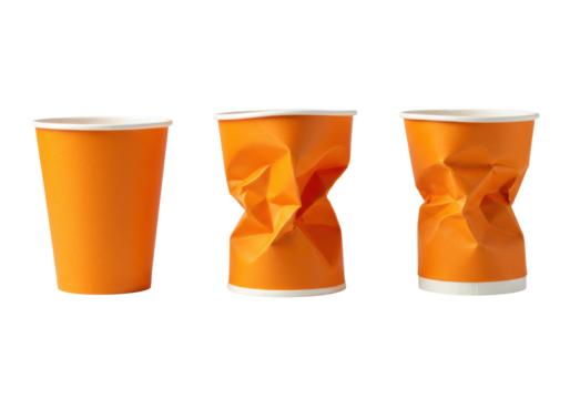 Three vibrant orange paper cups (pristine, crumpled, crushed) on a sterile white background, close-up shot. Concept of disposable waste and environmental impact