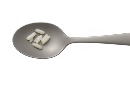 Spoon holding a few white rice grains. Concept presenting themes of hunger, poverty, scarcity, and limited food supply