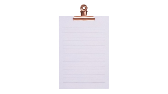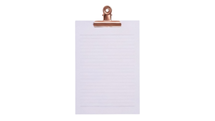 Lined paper sheet with rose gold clip isolated PNG on transparent background, stationery mockup for notes and reminders