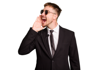 Security bodyguard man wearing a suit isolated cut out shouting and holding palm near opened mouth.