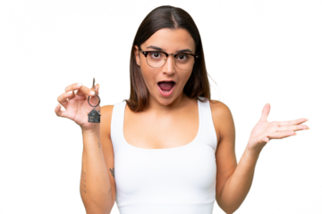 Woman holding keys handing over property symbolic transparent background