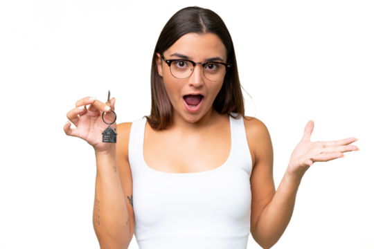 Young caucasian woman holding a home keys isolated pointing upside with opened mouth.