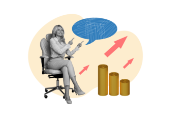 Creative picture collage mature cheerful lady business trader forex market improvement growth textbox speech increase earnings