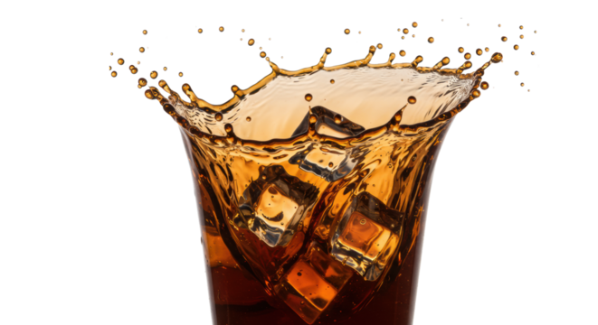 Rich amber-brown beverage, suggesting aged whiskey or rum, in a turbulent splash with ice cubes forming a gravity-defying crown on a transparent background, concept for beverage advertising
