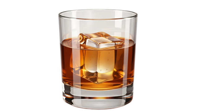 Whiskey glass with ice cubes isolated on transparent background, classic alcoholic drink concept for bar and nightlife design