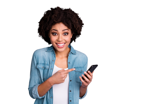Portrait of funny funky youth cute amazed advertise suggest select modern technology promo choose decide advise advert feedback wear trendy modern jeans clothes isolated grey background