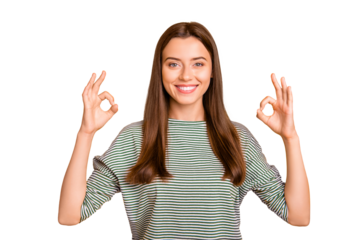 Photo of charming gorgeous woman giving us double okay sign while isolated with yellow background