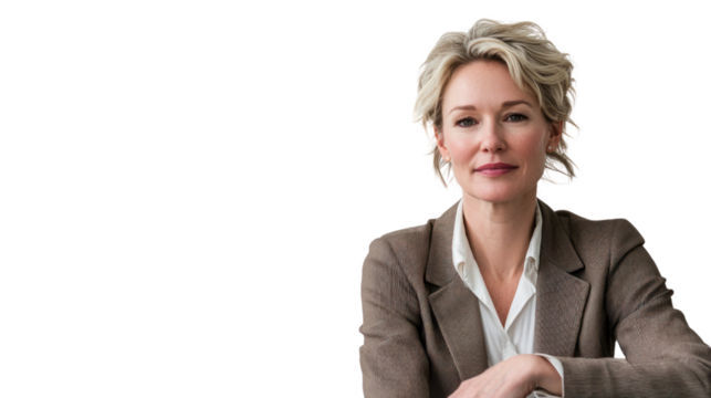 Professional woman in a business attire, sitting confidently with a thoughtful expression. Ideal for corporate and leadership themes.