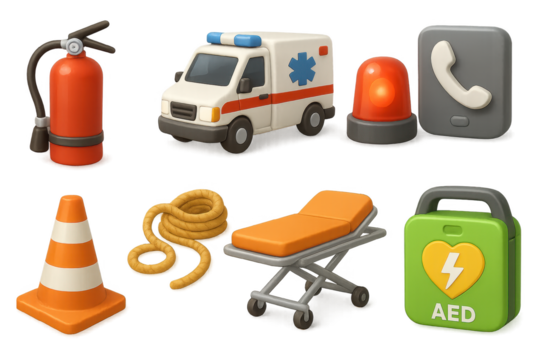 3d set of emergency tools icons. safety, rescue, and first aid symbols in 3d style