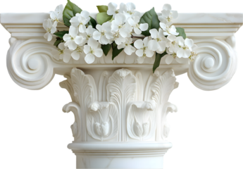 Ornate capital on a classical column topped with sprigs of blooming white flowers