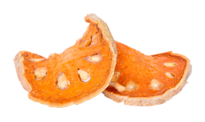 Aegle marmelos. Dry bael fruit isolated on white background.Dried herbs and dried bael fruit drink Healthy and Natural Food concept