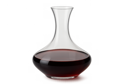 Elegant wine decanter holding red wine for aerating and serving, isolated with transparent background