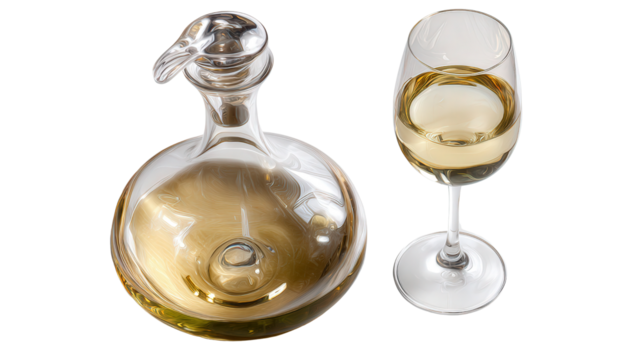 Elegant Wine Decanter: A flat lay of an elegant wine decanter with a glass of wine, isolated on a Transparent background, PNG file.