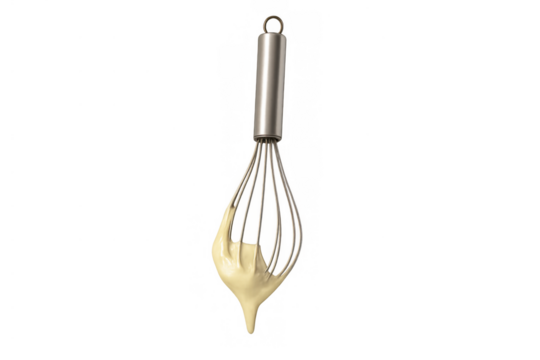 Whisk holding cream, a cooking utensil for baking and mixing batter, isolated on transparent background